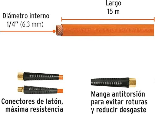 Ver todos los detallesMANGUERA COMPRESOR DE AIRE DE 15MTS REFORZADA DE 1/4 300 PSI NARANJA CLARO GRADO A