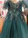Color y diseño : El vestido es de un llamativo color esmeralda y cuenta con tirantes de una sola pieza que destacan la línea del cuello de manera elegante. La parte superior está decorada con bordados y pedrería, añadiendo un toque de lujo.